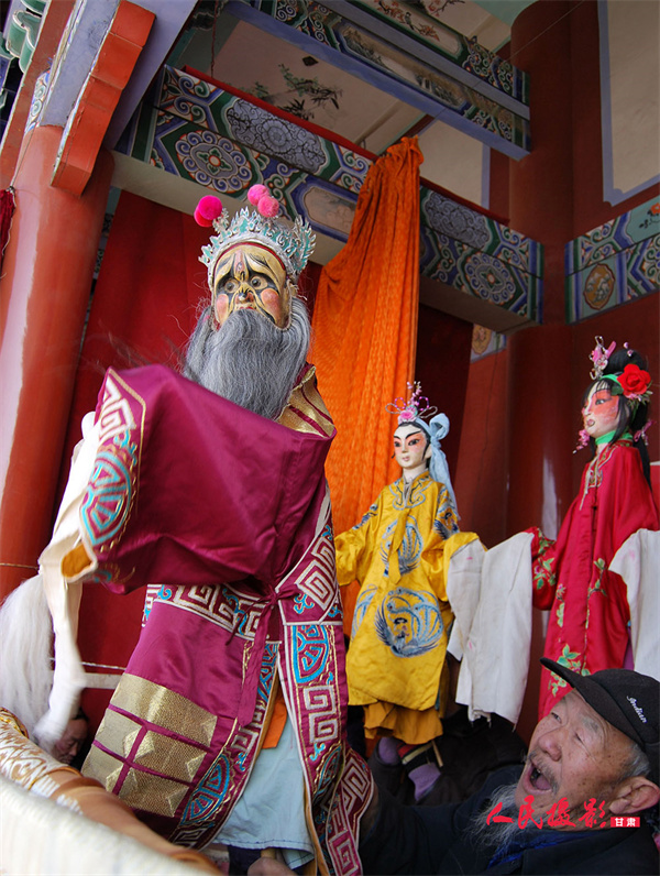 2012年2月1日,马登岐在武威南城门楼表演木偶戏