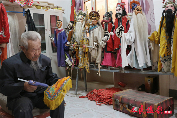 2021年11月20日,马登岐展示打扮好的木偶戏角色